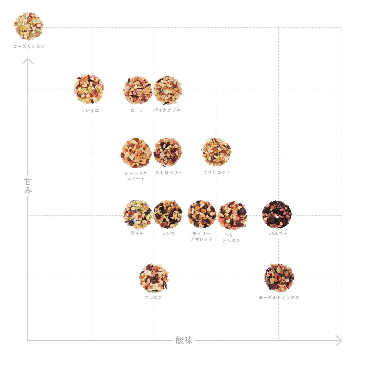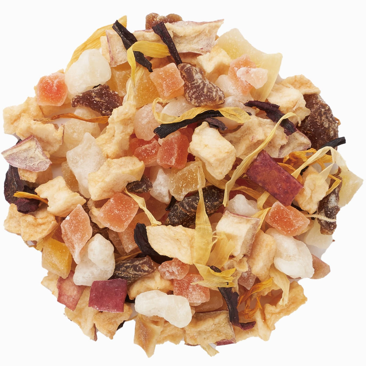加糖ドライパパイヤ(タイ製造)、加糖ドライメロン、加糖ドライマンゴー、有機ドライアップル、有機ドライアプリコット、有機ハイビスカス、有機マリーゴールド、有機米粉/香料、クエン酸、保存料(亜硫酸塩)
